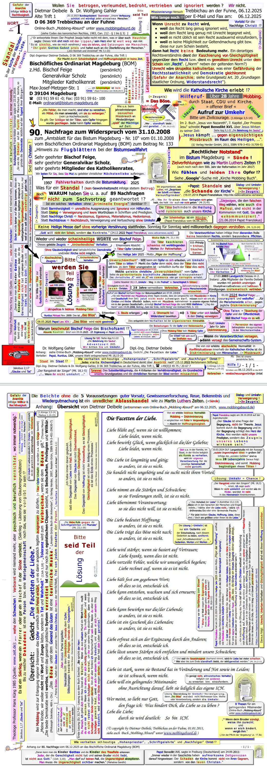 wird geladen wird geladen wird geladen wird geladen Die 89. Nachfrage vom 20.08.2025 entspricht dem Motto „Couragiert unterwegs - ich gehe mit“ der Bistums-Wallfahrt auf der Huysburg am 01.09.2019, zu welcher Bischof Feige am 07.07.2019 im "Tag des Herrn" eingeladen hat. (Siehe auch: ... 01.10.2008 „Amtsblatt für das Bistum Magdeburg mit Abschnitt“ Nr. 133 - „Hinweis zu Flugblättern bei der Bistumswallfahrt“) Wie wird Bischof Feige im Mühen um Übereinstimmung von WORT und TAT mit dieser Nachfrage umgehen? Wie „couragiert“ wird er sich diesmal zu seinen eigenen Aussagen verhalten !? Wie bereits mit meinem Flugblatt vom 07.09.2008, entspreche ich mit der 76. Nachfrage vom 07.02.2021 erneut seinem Aufruf. (07.09.2008 - Flugblatt für Gerechtigkeit und Rechtssicherheit in der Katholischen Kirche. „rechtlicher Notstand“ im Bistum Magdeburg) Sind Bischöfe christliche Hirten oder Heuchler und/oder „Polemiker“ !? wird geladen wird geladen Die von mir erlebte „Normalität“ in den letzten über 27 Jahren im Bistum Magdeburg Mobbing und/oder Diskriminierung hat/haben oft auch finanzielle Auswirkungen auf das/die Opfer. Nachfolgende Übersicht enthält eine Berechnungsgrundlage.